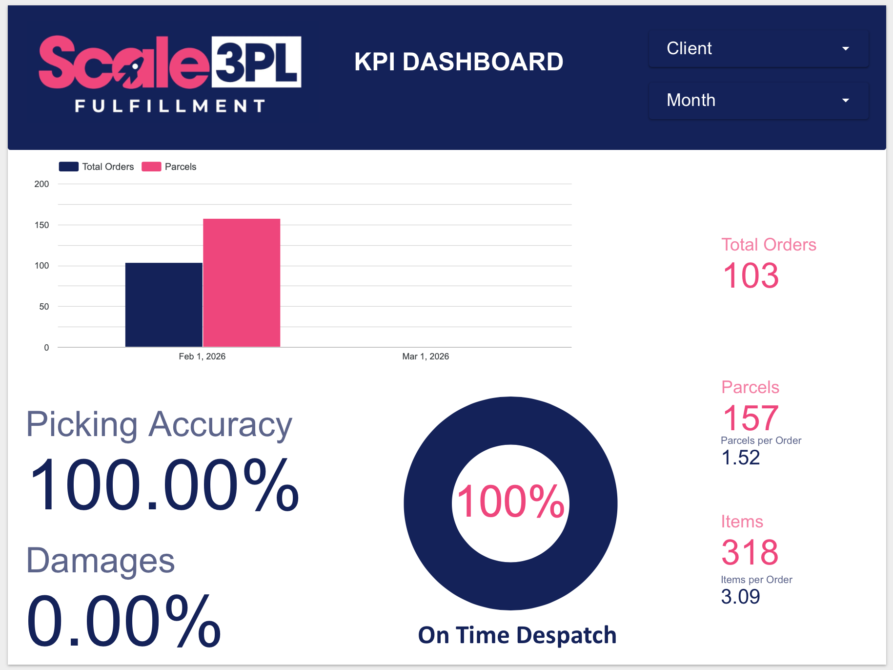 Scale3PL is pleased to introduce our Client KPI Dashboard, designed to provide full transparency into your fulfilment performance and operational efficiency.